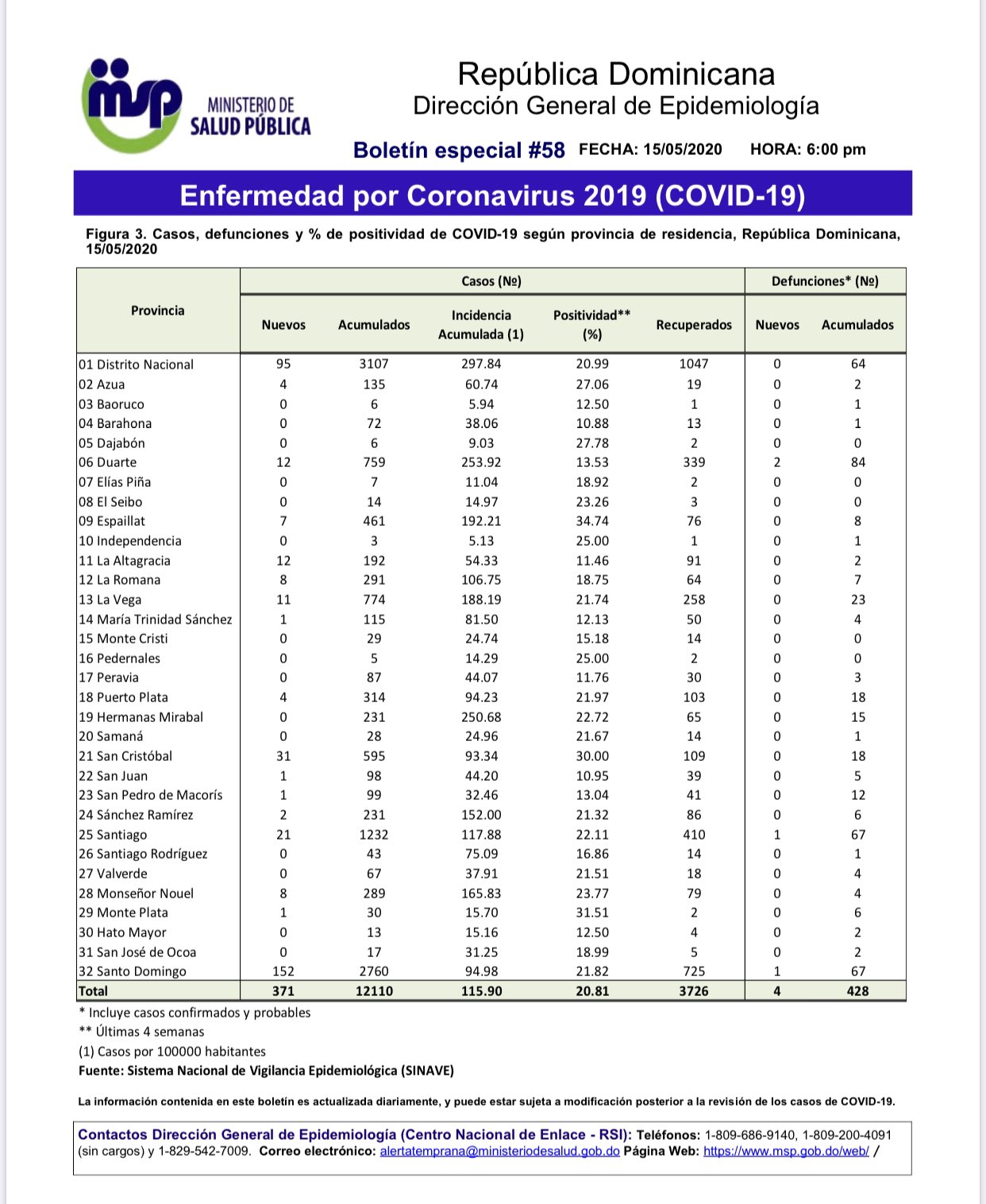 SANTO DOMINGO.- El ministerio de Salud Pública informó este sábado que aumentaron a 428 los muertos y 12, 110 los casos de coronavirus en el país.
