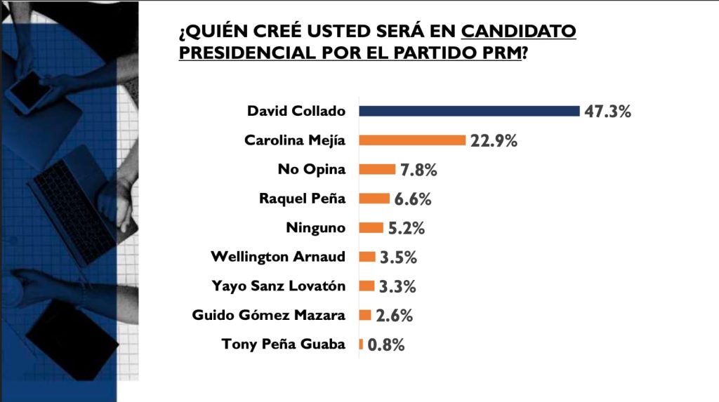 El 47.3% en el PRM percibe que Collado seria el candidato oficial, seguido por Mejía 22.9%.