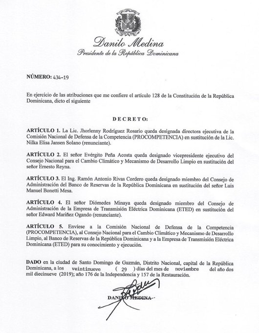 El decreto 434-19 designa además a Jhorlenny Rodríguez como directora ejecutiva de PROCOMPETENCIA en sustitución de Nilka Jansen.