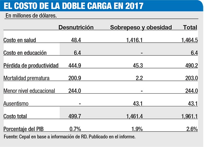 República Dominicana gastó US$1,961 millones en 2017 por efectos de la desnutrición y el sobrepeso. La doble carga de la malnutrición representó el 2.6% del producto interno bruto (PIB) en costos adicionales en educación y salud, y pérdida de productividad.