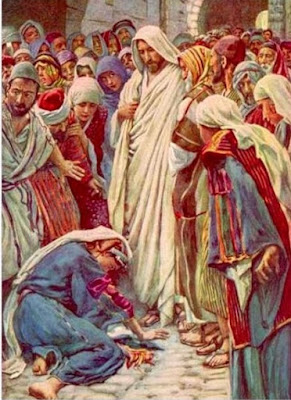 Jesús notó al instante que una fuerza curativa había salido de Él, se volvió hacia la gente y les preguntó: «¿Quién ha tocado mi manto?» Sus discípulos le contestaron: «Estás viendo cómo te empuja la gente y todavía preguntas: `¿Quién me ha tocado?’ » Pero Él seguía mirando alrededor, para descubrir quién había sido. Entonces se acercó la mujer, asustada y temblorosa, al comprender lo que había pasado; se postró a sus pies y le confesó la verdad. Jesús la tranquilizó, diciendo: «Hija, tu fe te ha curado. Vete en paz y queda sana de tu enfermedad».